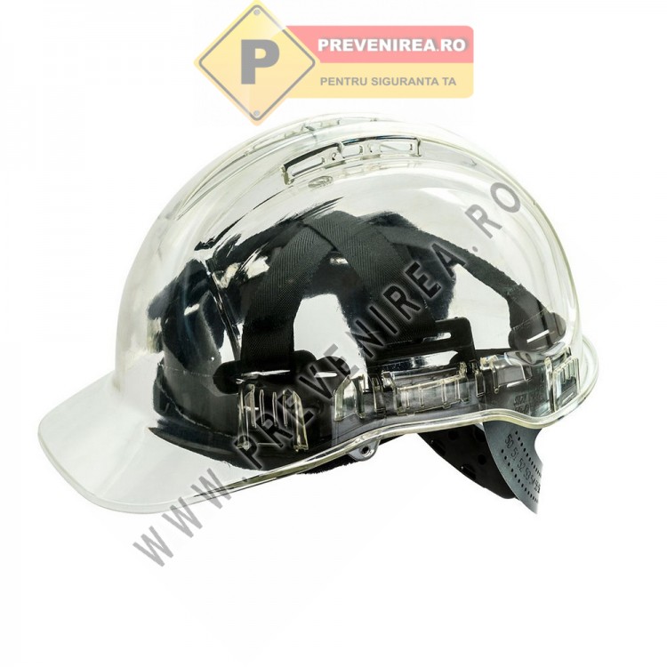 Casca de protecție ventilată albă Peak View PV50 reprezintă o inovație în domeniul echipamentelor de protecție. Carcasa sa transparentă, realizată din policarbonat ultra-ușor, permite vizibilitate prin cozoroc și zonele laterale, oferind purtătorului un câmp vizual extins fără a fi necesară înclinarea capului.