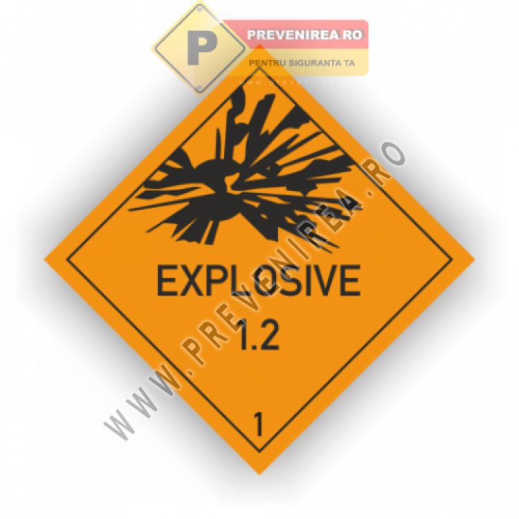 Eticheta Explozive 1.2 identifică materialele explozive care prezintă pericol de proiecție, dar fără risc major de incendiu în timpul transportului. Aceasta este obligatorie conform ADR (Acordul European privind transportul rutier internațional de mărfuri periculoase) și asigură vizibilitatea riscului pentru toți operatorii implicați.