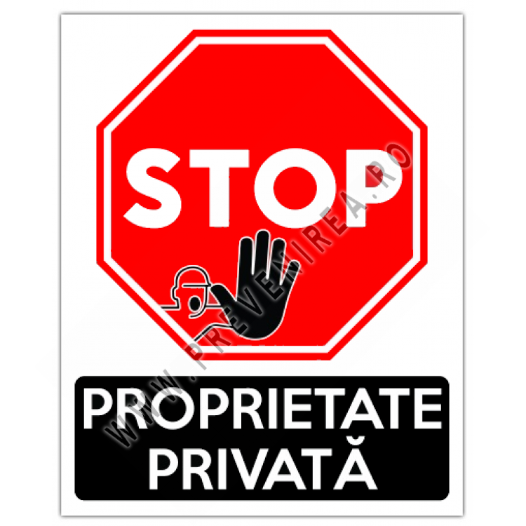 Etichete: Indicator stop proprietate privata, Indicatorul este recomandat pentru semnalizarea unei interdictii, intrucat are prezent textul "Stop / Proprietate privata". Acesta este realizat din PVC de 2 mm, are forma octogonala, inaltimea de 37 cm si permite modalitati de prindere diverse: banda dublu-adeziva, holzsuruburi, moment express fix.