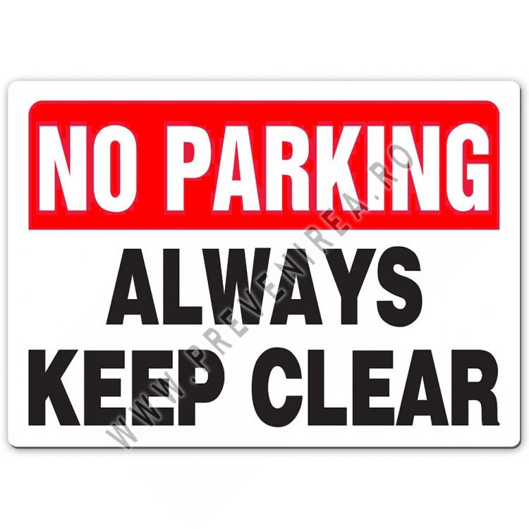 Etichete: No parking always keep clear, No Parking Keep Clear Sign. Helps prevent unwanted parked vehicles which may cause obstruction to private property., Designed to inform motorists that parking is prohibited and the area must be kept clear, this sign is a must-have for any location where vehicle-free zones
