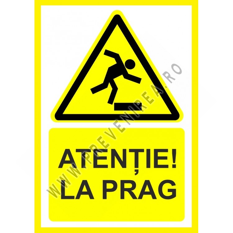 Etichete: Placuta atentie la prag, Atentie La Prag - semn cu diferite dimensiuni A5, A4, A3. ... Indicator de securitate de avertizare imprimat pe suport autocolant vinyl si aplicat pe placa, Caracteristici tehnice: Dimensiuni: 20x30 cm; Material: Placa PVC; Imprimare prin serigrafie cu textul 'Atentie la prag'. Nu ezitati sa contactati aici