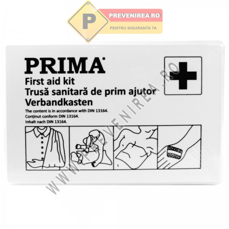 Continutul trusei auto de prim ajutor: Dispozitiv respiratie gura la gura (1 bucata) Leucoplast 2,5cm x 2,5m (1 rola) Pansament 10 x 6cm (4 bucati) Comprese sterile 10 x 8cm x 25 bucati (5 pachete) Fasa tifon 5cm x 4m (2 bucati) Fasa tifon 10cm x 4m (2 bucati) Bandaj triunghiular l=80mm (2 bucati) Pansament steril absorbant - 2 dimensiuni (4 bucati) Fasa elastica 5cm x 4m (1 bucata) Manusi examinare (2 perechi) Ace siguranta (6 bucati) Folie de supravietuire izoterma (1 bucata) Brosura prim ajutor (1 bucata)Avizata de Ministerul Sanatatii Publice si RAR. Valabilitate 24 luni